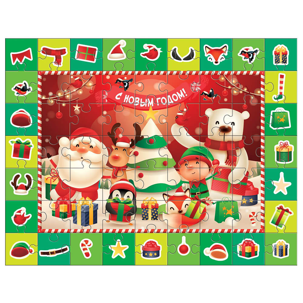Новогодний чемоданчик в красно-белом оформлении. На упаковке задачи на логику и внимание. Внутри коробки: пазлы с новогодним сюжетом, 63 детали.